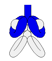 Squeeze the air in the third balloon toward the tail end to distribute it evenly, and then twist in the middle, making two equal bubbles. Place this twist through the large loop in dark balloon 2 behind the lips. Twist the ends of the large loop together, locking balloon 3 in place.
