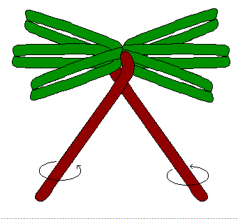 然後將二條棕色 260q充滿並稍微漏氣後,將二者的嘴部綁在一起,繞過星狀葉子的中央結點。接著要捻出一條麻花來,捻法是:拉著二條氣球旋轉相同的方向,就能將二者捻在一起。