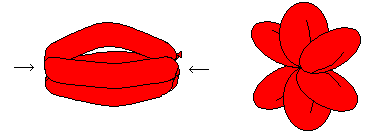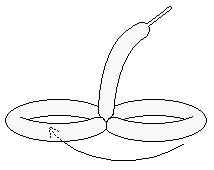 1"尾部為止。把頭尾綁在一起形成一個圓圈(盡量綁在尾部尖端部位,留下未充氣部分於球體上,形成柔軟的球體)。然後把球體壓成平行的兩段如上圖,接著旋轉其中一段形成兩個結點平分球體為相等的兩部分(若不相等,應轉開結點,擠壓較長一方的球體使其等長)。